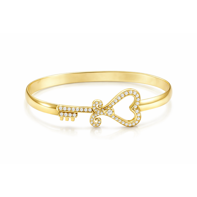 This 4mm Quinn's Diamond Key to Her Heart cuff bracelet features 0.78 ctw of diamonds, set in 14k yellow gold. With its timeless design, it offers a beautiful blend of elegance and meaning, making it a perfect addition to any collection.