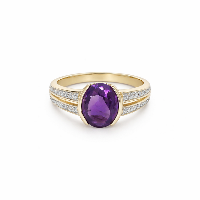 This amethyst and diamond ring delivers rich color and refined sparkle in a balanced, modern design. Crafted in polished 14K yellow gold, the ring features a bold oval amethyst secured in a sleek semi-bezel setting, offering both visual strength and everyday wearability.