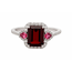 This exquisite ring is a captivating blend of color, elegance, and craftsmanship. At its center shines a deep red 1.68 ct emerald-cut garnet, symbolizing passion and strength. On either side, pink topaz gemstones add a delicate touch of femininity and charm, while a halo of round brilliant diamonds (0.21 ctw) enhances the sparkle and sophistication.