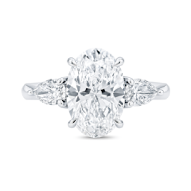 The oval center diamond radiates brilliance and grace, symbolizing the strength of the present moment, while the pear-cut side stones represent the past and future—creating a visual story of eternal love and lasting devotion. The contrast between the soft curves of the oval and the delicate points of the pears adds dimension and sophistication, resulting in a design that feels both modern and timeless.