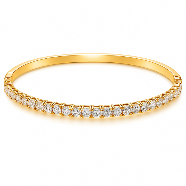 The flexible bangle design allows for an easy slip-on fit that contours perfectly to the wrist. Each diamond is individually secured in a polished gold setting, creating a continuous ribbon of sparkle that moves gracefully with every gesture.