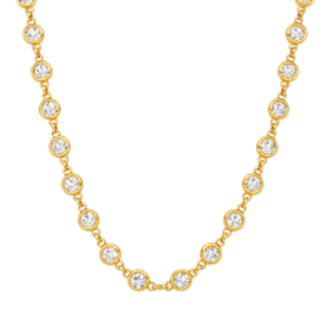 The bezel-set design enhances durability while showcasing each diamond’s natural brilliance, allowing light to reflect beautifully from every angle. The fluid gold links create a graceful flow that drapes elegantly along the neckline, balancing bold sparkle with understated elegance.