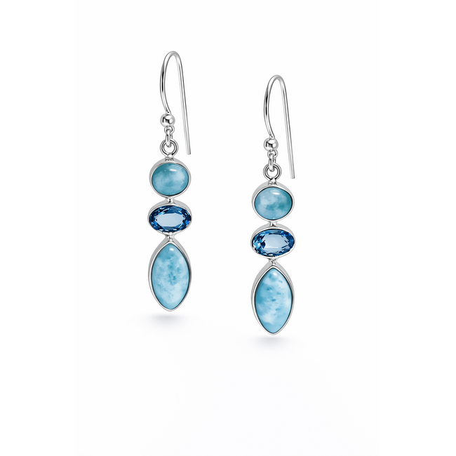 Larimar & blue topaz 3 stone dangle earrings sterling silver