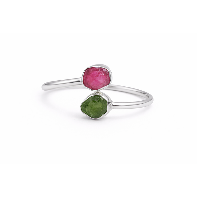 Pink & Green Tourmaline free form rough 2 stone ring sterling silver