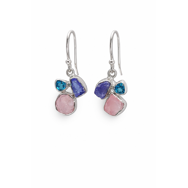 Rose quartz, tanzanite, blue topaz dangle earrings sterling silver