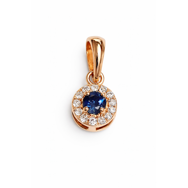 Sapphire (0.15ct) & diamond (0.08 ctw) round halo pendant 14k yellow gold 0.7 gr