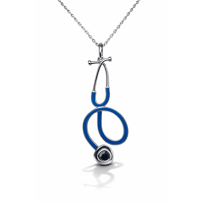 A sleek silver stethoscope pendant with vibrant blue enamel, combining medical inspiration with a pop of color for a unique and stylish accessory.